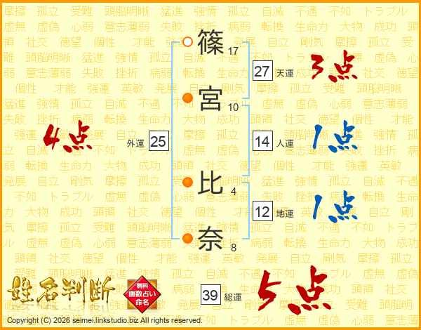 篠宮比奈さんの総運は39画の5点!