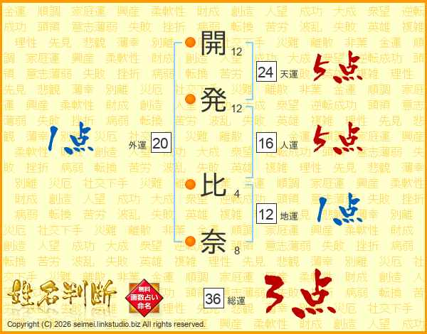 生活面を象徴する運勢です。外部から受ける影響力を表し、結婚運、家庭運や職場、環境への順応性を表します。総運から人運を引いた画数。姓や名が1文字の場合を除く。