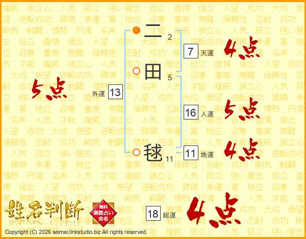 二田毬さんの総運は18画の4点!