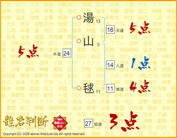 湯山毬さんの総運は27画の3点!