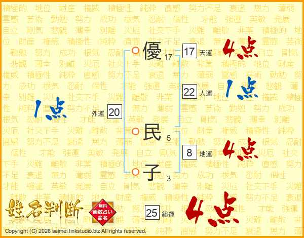 生活面を象徴する運勢です。外部から受ける影響力を表し、結婚運、家庭運や職場、環境への順応性を表します。総運から人運を引いた画数。姓や名が1文字の場合を除く。
