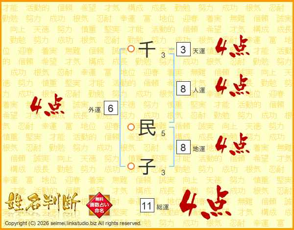 生活面を象徴する運勢です。外部から受ける影響力を表し、結婚運、家庭運や職場、環境への順応性を表します。総運から人運を引いた画数。姓や名が1文字の場合を除く。