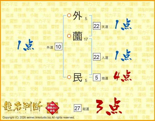 生活面を象徴する運勢です。外部から受ける影響力を表し、結婚運、家庭運や職場、環境への順応性を表します。総運から人運を引いた画数。姓や名が1文字の場合を除く。