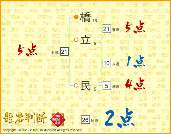 生活面を象徴する運勢です。外部から受ける影響力を表し、結婚運、家庭運や職場、環境への順応性を表します。総運から人運を引いた画数。姓や名が1文字の場合を除く。