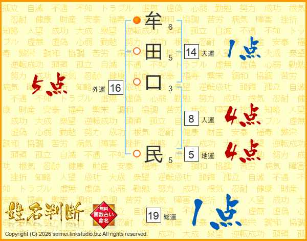 生活面を象徴する運勢です。外部から受ける影響力を表し、結婚運、家庭運や職場、環境への順応性を表します。総運から人運を引いた画数。姓や名が1文字の場合を除く。