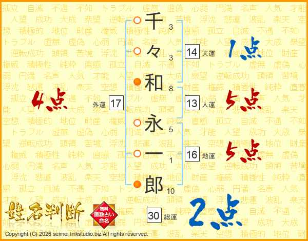 千々和永一郎さんの人運は13画の5点!