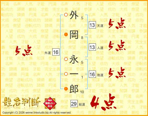 外(5画)岡(8画) 永(5画)一(1画)郎(10画)