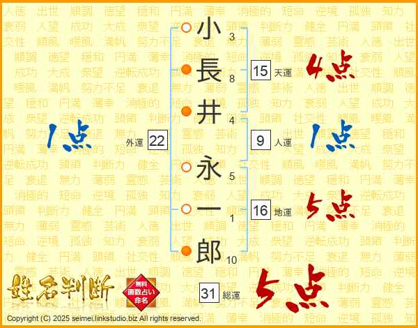 小(3画)長(8画)井(4画) 永(5画)一(1画)郎(10画)