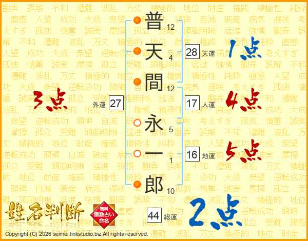 普(12画)天(4画)間(12画) 永(5画)一(1画)郎(10画)