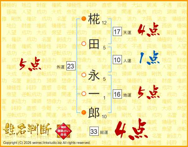 椛(12画)田(5画) 永(5画)一(1画)郎(10画)