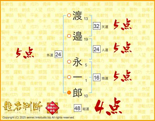 渡(13画)邉(19画) 永(5画)一(1画)郎(10画)