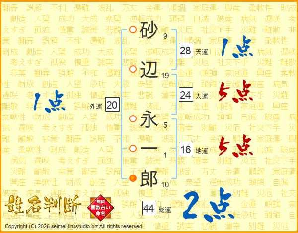 砂(9画)辺(19画) 永(5画)一(1画)郎(10画)