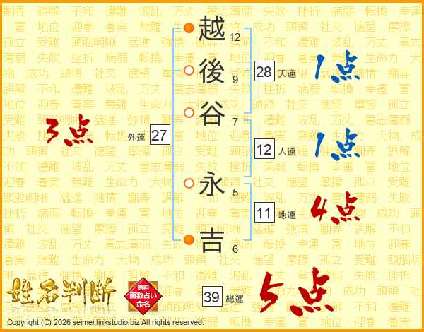 越(12画)後(9画)谷(7画) 永(5画)吉(6画)