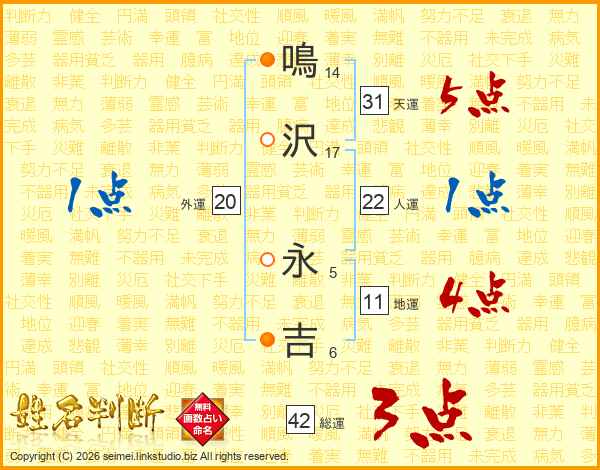 鳴(14画)沢(17画) 永(5画)吉(6画)