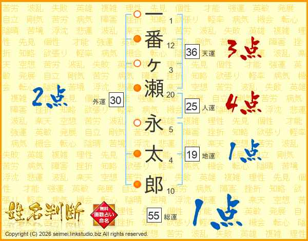 一(1画)番(12画)ヶ(3画)瀬(20画) 永(5画)太(4画)郎(10画)