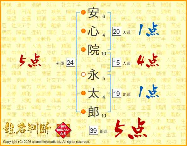 安(6画)心(4画)院(10画) 永(5画)太(4画)郎(10画)