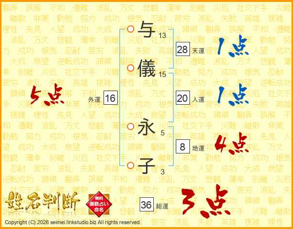 生活面を象徴する運勢です。外部から受ける影響力を表し、結婚運、家庭運や職場、環境への順応性を表します。総運から人運を引いた画数。姓や名が1文字の場合を除く。