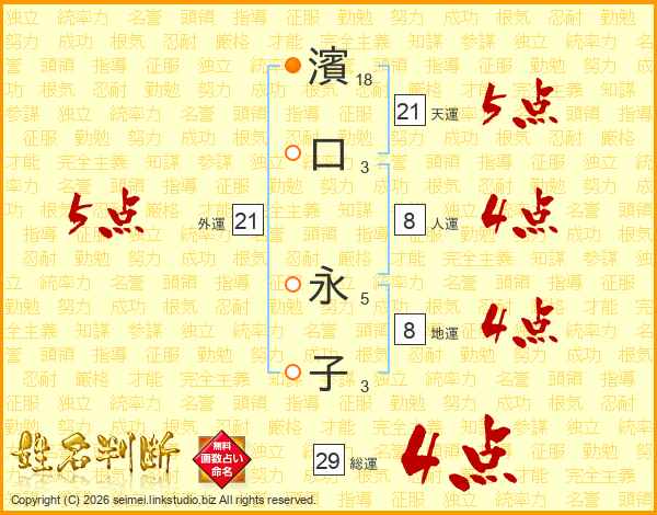 あなたの人生を表す1番重要な運勢です。生涯を通じて影響する総合運となり、主に50歳以降の晩年期に影響を及ぼします。苗字と名前の合計画数。