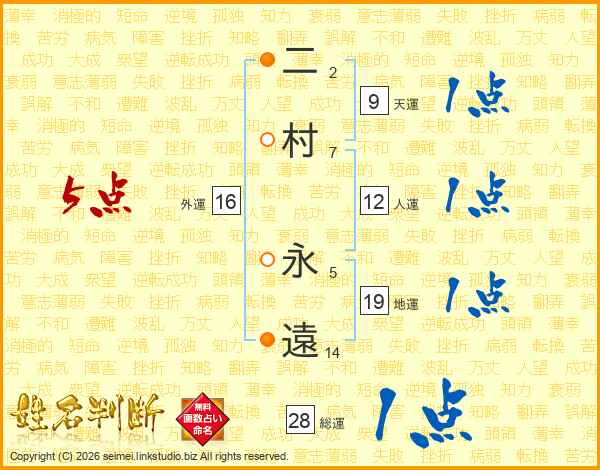生活面を象徴する運勢です。外部から受ける影響力を表し、結婚運、家庭運や職場、環境への順応性を表します。総運から人運を引いた画数。姓や名が1文字の場合を除く。