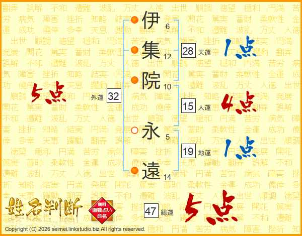 伊(6画)集(12画)院(10画) 永(5画)遠(14画)