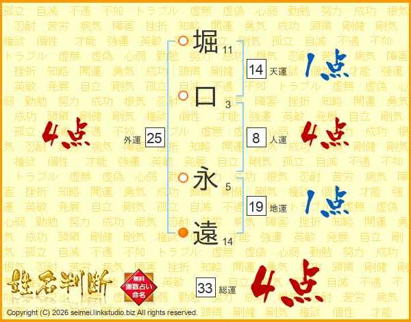 生活面を象徴する運勢です。外部から受ける影響力を表し、結婚運、家庭運や職場、環境への順応性を表します。総運から人運を引いた画数。姓や名が1文字の場合を除く。