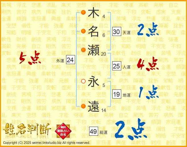 木(4画)名(6画)瀬(20画) 永(5画)遠(14画)