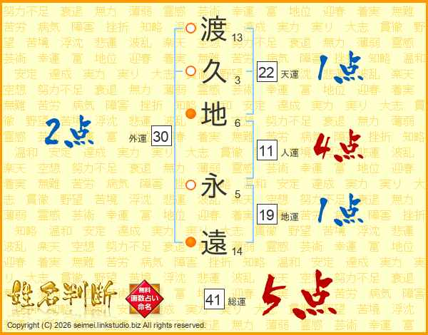 渡(13画)久(3画)地(6画) 永(5画)遠(14画)