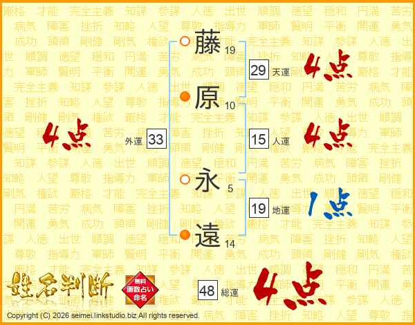 生活面を象徴する運勢です。外部から受ける影響力を表し、結婚運、家庭運や職場、環境への順応性を表します。総運から人運を引いた画数。姓や名が1文字の場合を除く。