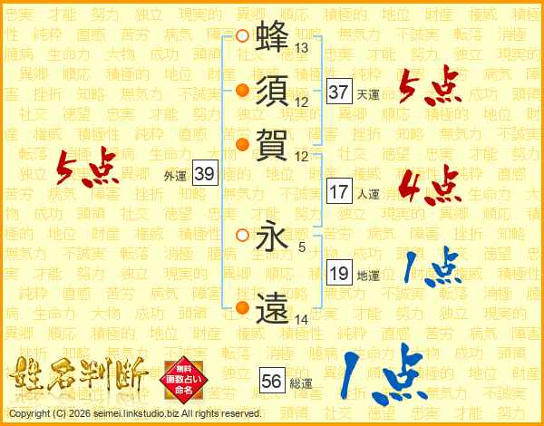 蜂(13画)須(12画)賀(12画) 永(5画)遠(14画)