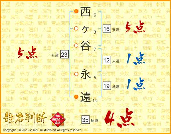 西(6画)ヶ(3画)谷(7画) 永(5画)遠(14画)