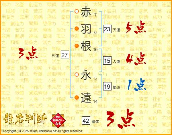 赤(7画)羽(6画)根(10画) 永(5画)遠(14画)