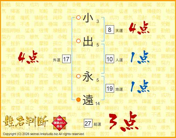 生活面を象徴する運勢です。外部から受ける影響力を表し、結婚運、家庭運や職場、環境への順応性を表します。総運から人運を引いた画数。姓や名が1文字の場合を除く。