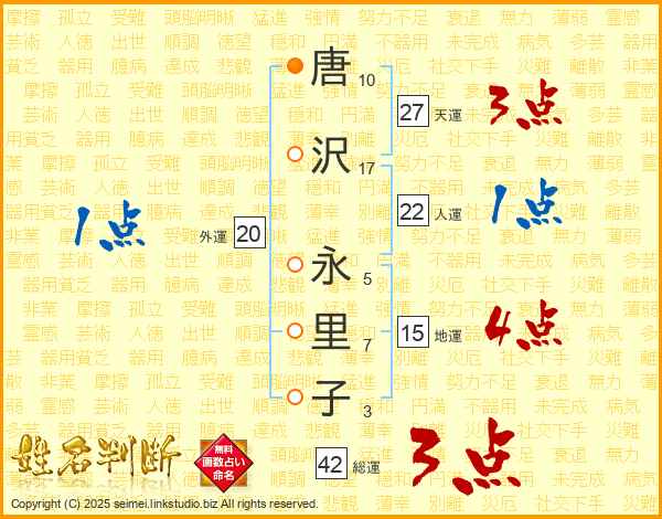 唐(10画)沢(17画) 永(5画)里(7画)子(3画)