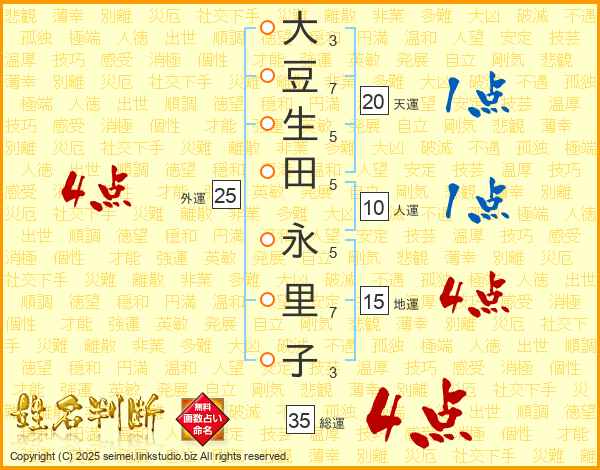 大(3画)豆(7画)生(5画)田(5画) 永(5画)里(7画)子(3画)