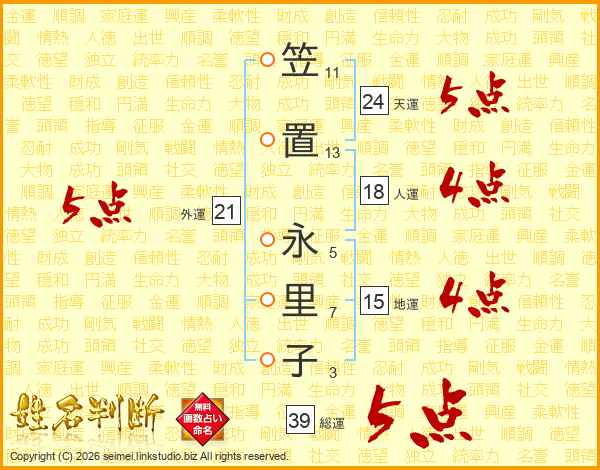 笠(11画)置(13画) 永(5画)里(7画)子(3画)