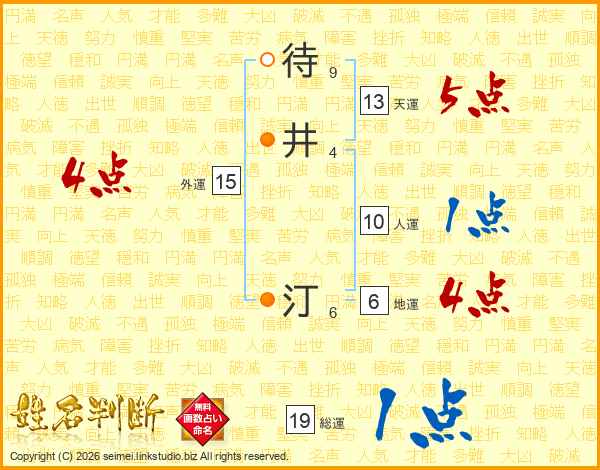 生活面を象徴する運勢です。外部から受ける影響力を表し、結婚運、家庭運や職場、環境への順応性を表します。総運から人運を引いた画数。姓や名が1文字の場合を除く。