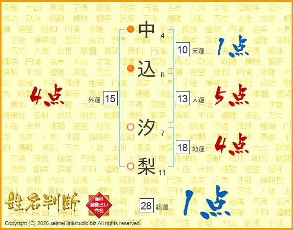 生活面を象徴する運勢です。外部から受ける影響力を表し、結婚運、家庭運や職場、環境への順応性を表します。総運から人運を引いた画数。姓や名が1文字の場合を除く。