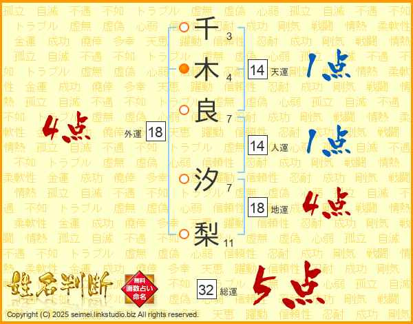千(3画)木(4画)良(7画) 汐(7画)梨(11画)