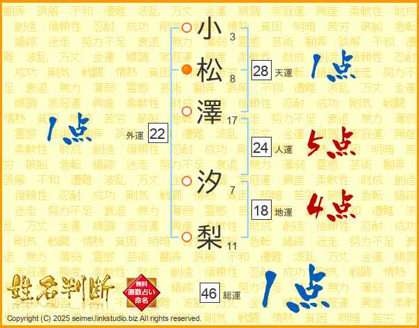 小(3画)松(8画)澤(17画) 汐(7画)梨(11画)