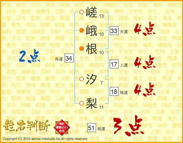 嵯(13画)峨(10画)根(10画) 汐(7画)梨(11画)