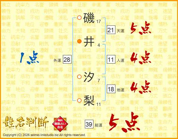 磯(17画)井(4画) 汐(7画)梨(11画)
