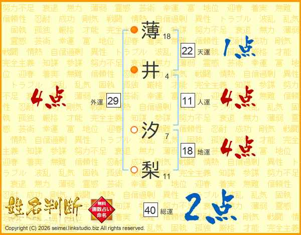 薄(18画)井(4画) 汐(7画)梨(11画)
