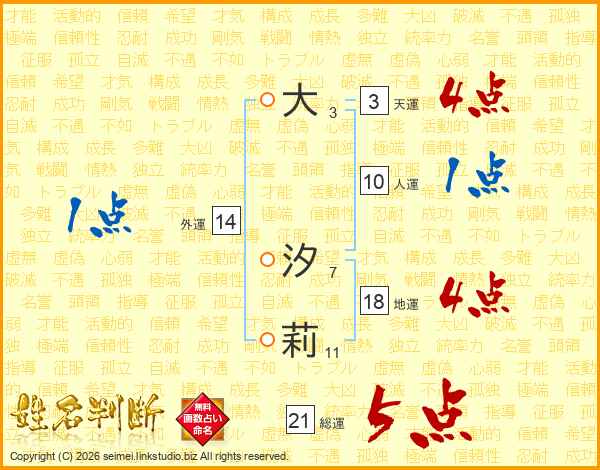 生活面を象徴する運勢です。外部から受ける影響力を表し、結婚運、家庭運や職場、環境への順応性を表します。総運から人運を引いた画数。姓や名が1文字の場合を除く。