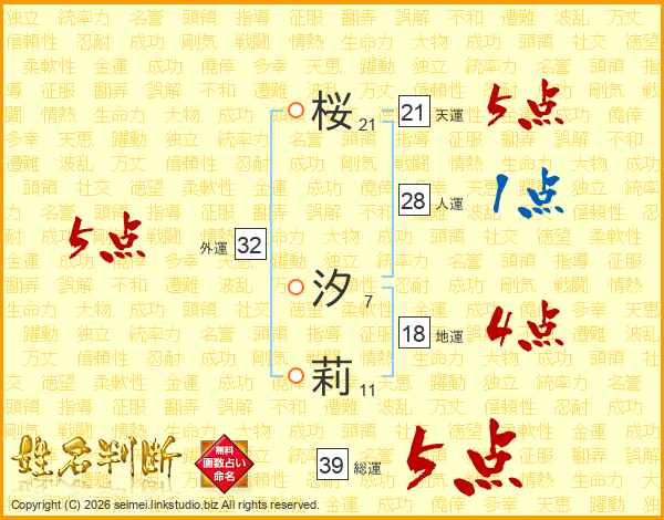 あなたの人生を表す1番重要な運勢です。生涯を通じて影響する総合運となり、主に50歳以降の晩年期に影響を及ぼします。苗字と名前の合計画数。