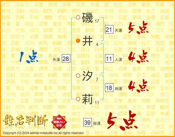 磯(17画)井(4画) 汐(7画)莉(11画)