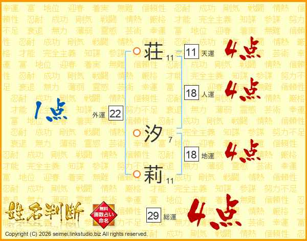 生活面を象徴する運勢です。外部から受ける影響力を表し、結婚運、家庭運や職場、環境への順応性を表します。総運から人運を引いた画数。姓や名が1文字の場合を除く。