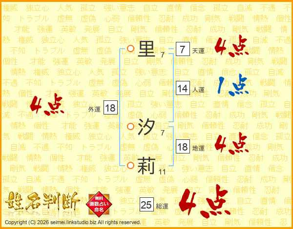 生活面を象徴する運勢です。外部から受ける影響力を表し、結婚運、家庭運や職場、環境への順応性を表します。総運から人運を引いた画数。姓や名が1文字の場合を除く。