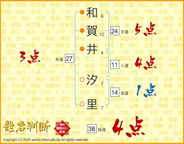 和(8画)賀(12画)井(4画) 汐(7画)里(7画)