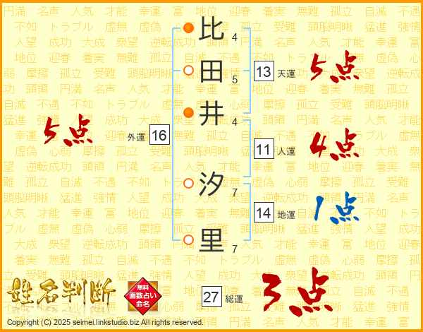 比(4画)田(5画)井(4画) 汐(7画)里(7画)