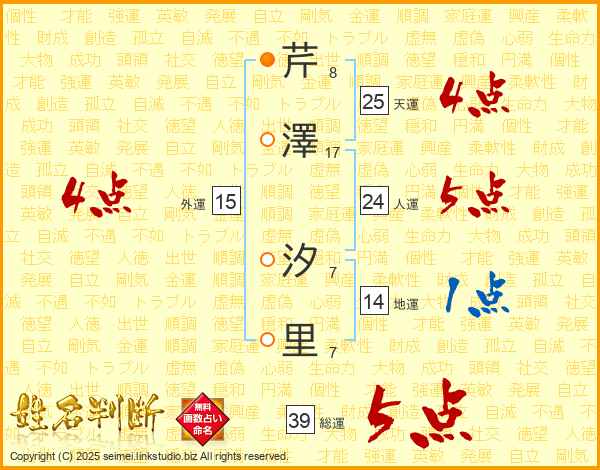 芹澤汐里さんの総運は39画の5点!